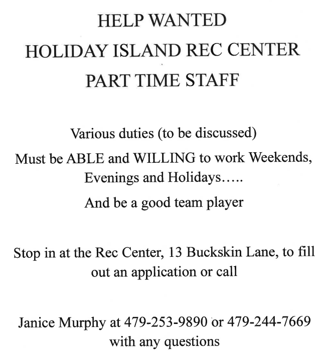 Holiday Island Suburban Improvement is an Equal Opportunity Employer and values diversity in its workforce. Applicants selected as finalists for this position will be subject to a comprehensive background check.