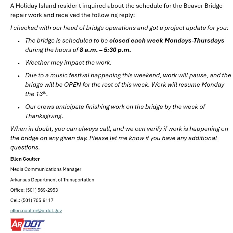 Interested parties can email their resume to office@cityofholidayisland.com or mail to City Of Holiday Island, PO Box 3099, Holiday Island, AR 72631. An application form can be downloaded from the city website at www.cityofholidayisland.com. Applications will be accepted until 11-30-25