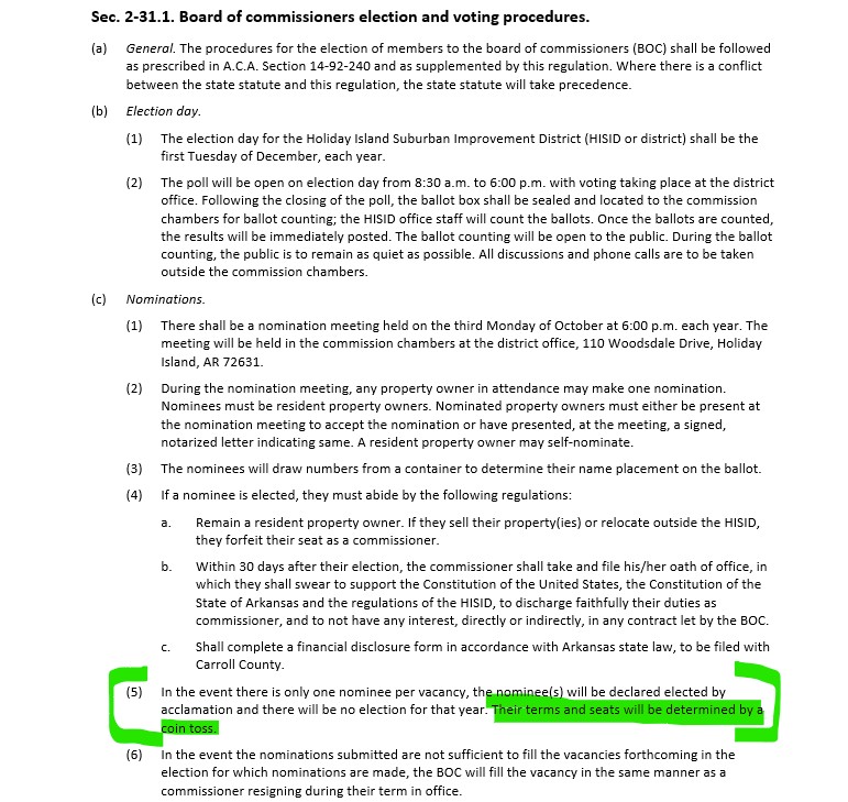 HISID Code, Sec-31.1., (c), (5), states “In the event there is only one nominee per vacancy, the nominee(s) will be declared elected by acclamation and there will be no election for that year. Their terms and seats will be determined by a coin toss.”